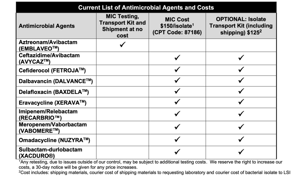 An optional isolate transport kit can be sent via overnight delivery to the requesting laboratory, which includes a UN3373 transport box, bacterial transport swab, isolate submission form and a return air bill for shipment back to LSI ($100 total). This charge does NOT apply for isolates submitted for aztreonam/avibactam testing.
